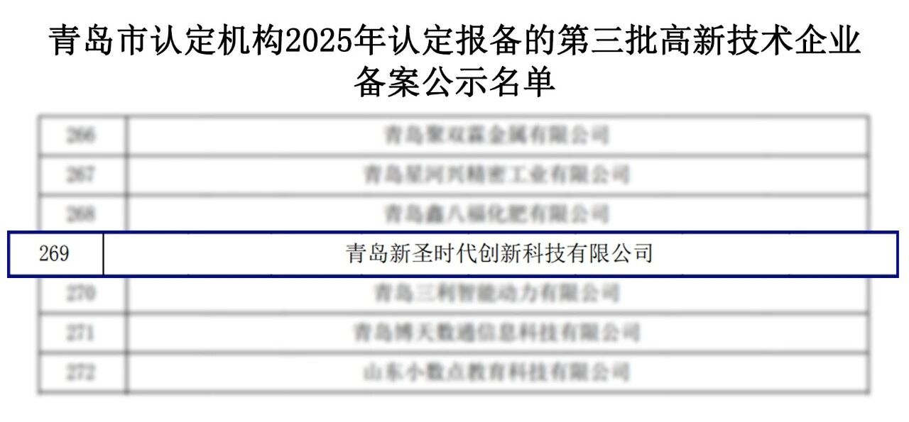 On December 19th, the Office of the Leading Group for the Management of National High tech Enterprise Recognition announced the list of the third batch of high-tech enterprises recognized by Qingdao's recognition institutions in 2025. Qingdao New Holy Era Innovation Technology Co., Ltd., a subsidiary of Singal Technology Group, was successfully selected.